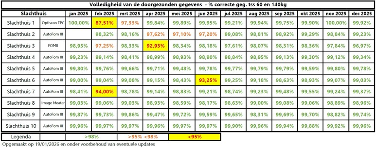 | Deze tabel geeft het aandeel weer van de verplicht in te delen vleesvarkens (60-140kg) waarvan wordt aangenomen dat het geraamd %MV effectief, correct en volledig werd gemeten door het erkende indelingstoestel in ieder slachthuis. Dit wordt gedaan door de schattingsformule per karkas te herberekenen en te vergelijken met de informatie doorgegeven door het slachthuis. Ieder karkas dat niet of niet correct werd ingedeeld zal zorgen voor een lagere waarde in deze tabel. |